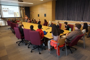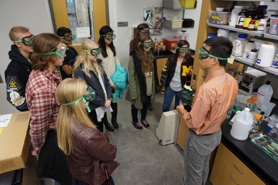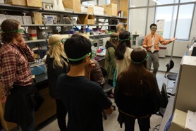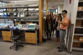 Dr. Zhao gives high school students a tour of the lab and biosciences building.